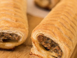 This delicious sausage roll is created using a vegan sausage mix with a tasty onion seasoning which is then encased in a rich puff pastry that has a straight edge and is sealed on the side of base.